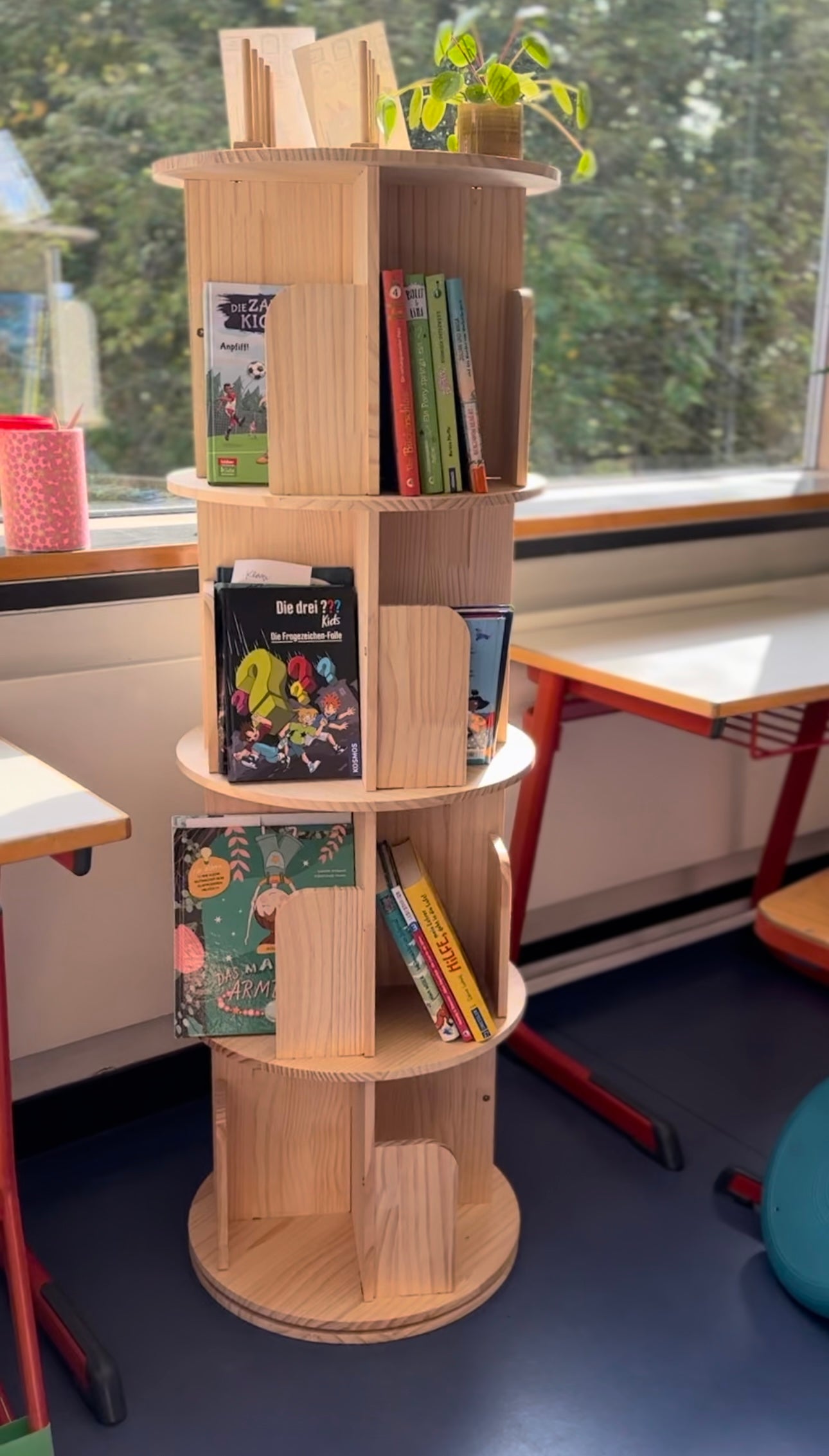 The bookcase is 128 cm high and has 4 tiers with a diameter of 44 cm. It is made of hand-polished pine wood, odorless and can hold about 100 books. It is stable, child-safe and space-saving, ideal for any room size. Flexible in assembly and adjustment.